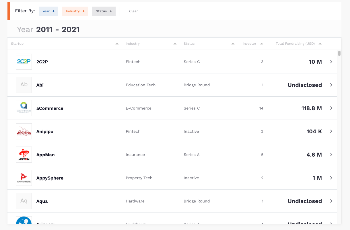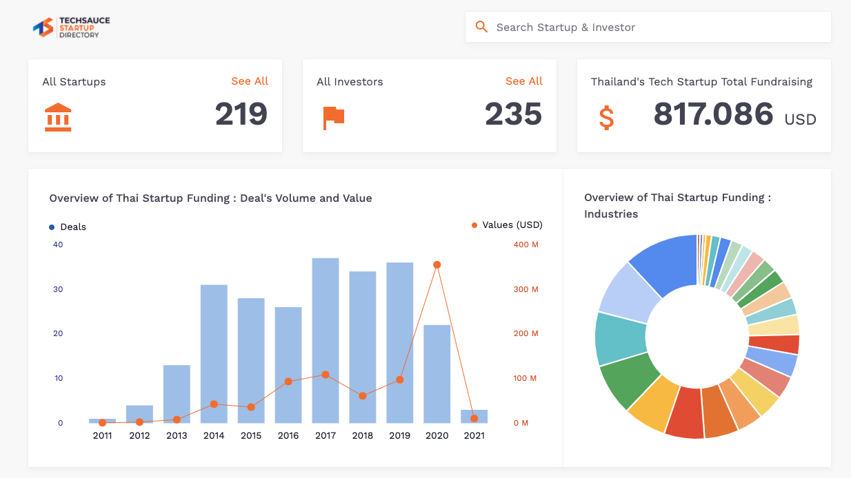 - ‘Overview of Thai Startup Funding: Volume and Value of Deals” (on the homepage) shows you the number of startups’ funding in Thailand as well as their status from the seed round onwards.