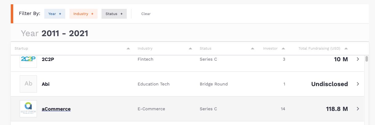 - Users can use the deal table on the homepage. Users can click on the startup’s name or investor’s name to access the individual startup and investor.